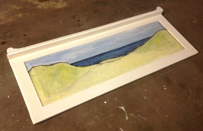 Voormalige kastdeur wordt helder schilderij. De duinen liggen er ontspannen bij. Schildering op hout. Afgelakt. 60 x 150 x 8 cm. VERKOCHT.